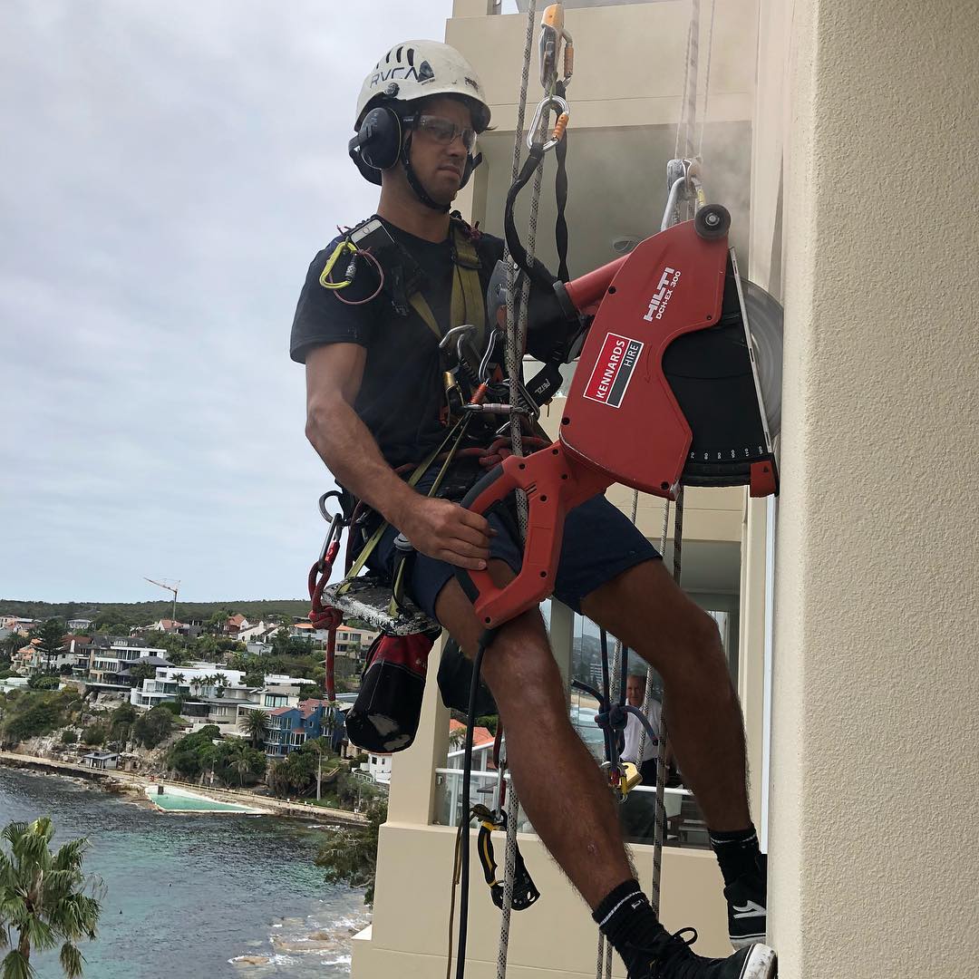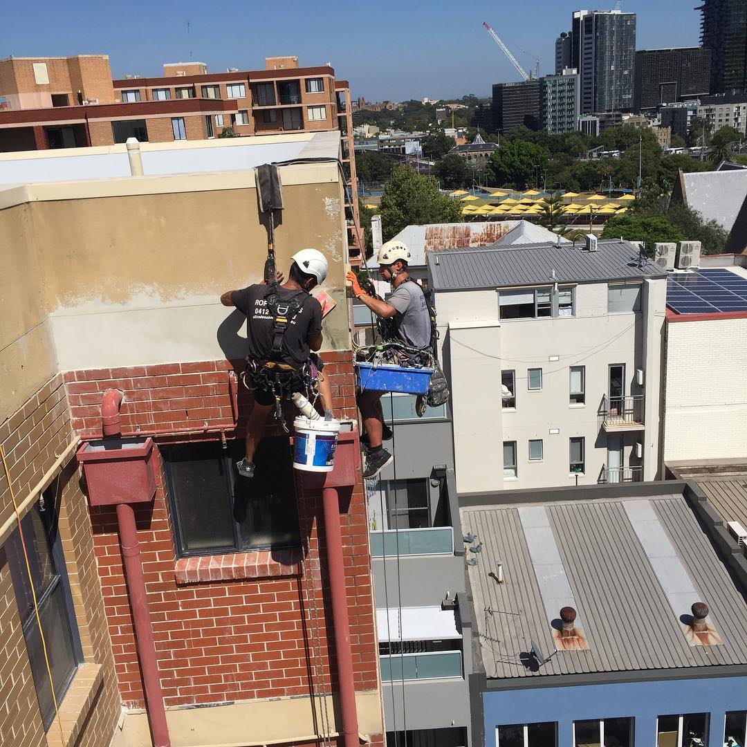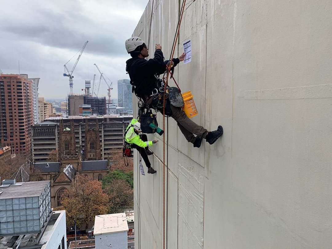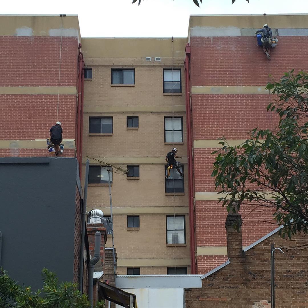 Progress @ Surry Hills. All slab band failing render removed and reinstated. #cheaperthanscaffold #petzl #petsofinstagram #ropeaccesstechnician #ropeaccess